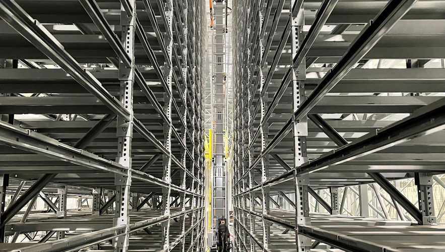 SRM(Storage Retrieval Machine)는 높게 솟은 보관 랙 사이의 통로(Aisle)를 따라 주행하며, 화물(팔레트나 박스)을 지정된 위치에 자동으로 입고하거나 출고하는 자동 주행 크레인입니다.
